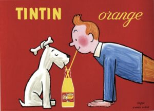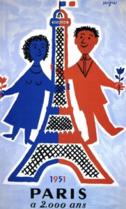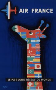 一見するとかわいいキリンのイラストですが、体に描かれた国旗は「世界とのつながり」を表し、長い首は「遠くまで届く広いネットワーク」を意味しています。さらに、そばに描かれた飛行機によって航空会社を表しており、この作品はエールフランス の広告ポスターでした。